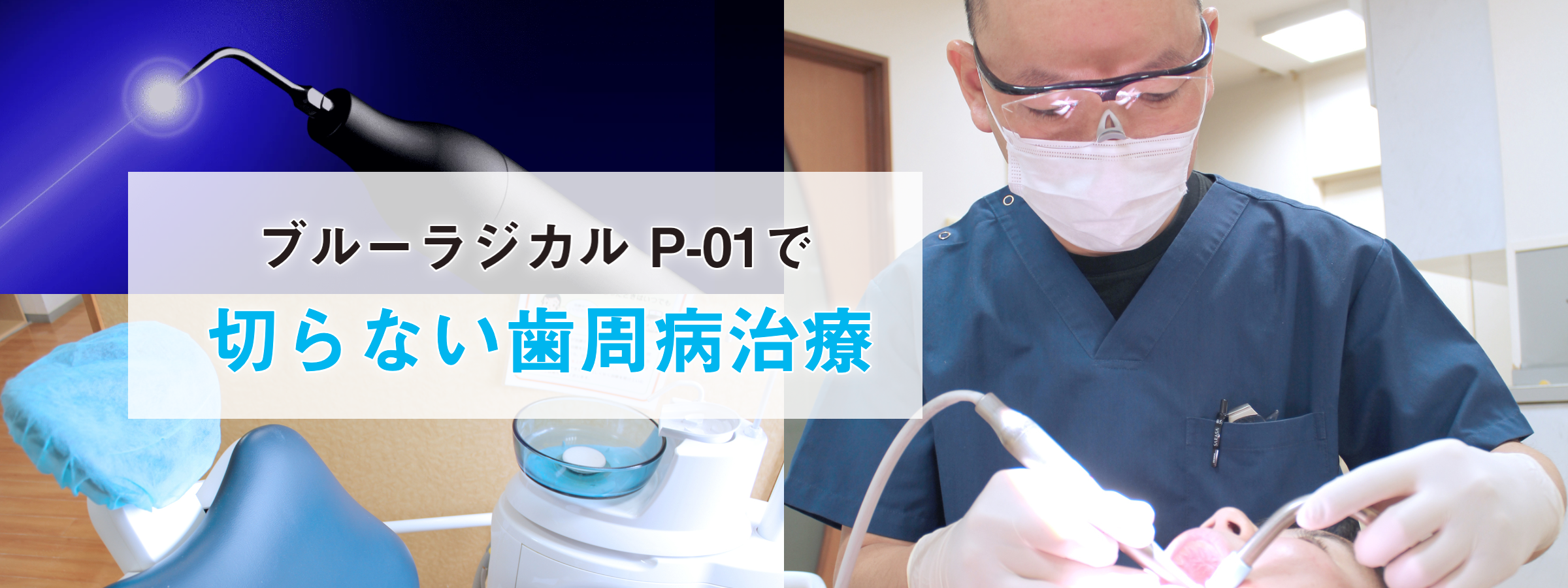 さらに、厚生労働省承認の機器「ブルーラジカル P-01」を使用。特殊な薬剤と青色LEDを組み合わせ、99.99%の殺菌効果で歯周病の原因菌にアプローチします。薬剤が届きにくい部分にも作用しやすい点が特徴です。