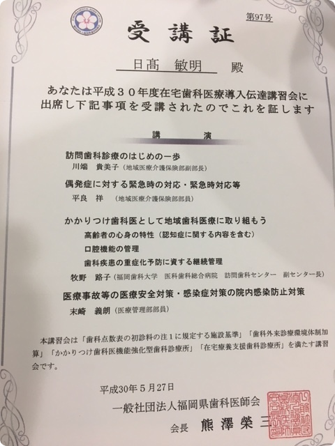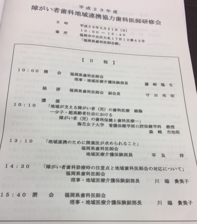 障がい者歯科地域連携協力歯科医師研修会に行ってきました。障がい者の歯科治療を地域で診ていくためのコーディネーター役となるための研修会でした。