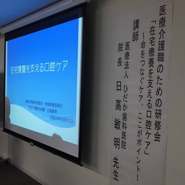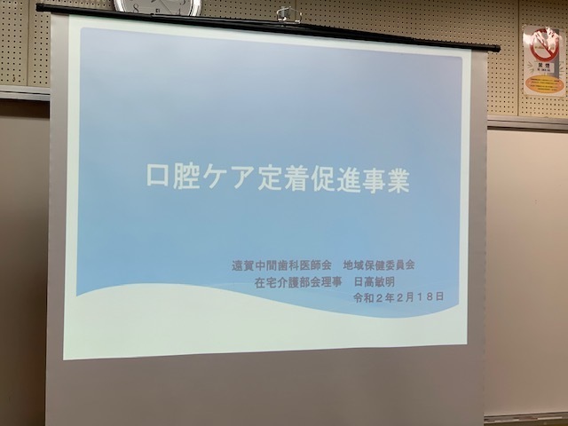 遠賀中間医師会在宅総合支援センターで『在宅療養を支える口腔ケア』というテーマで講師としてお話をしてきました。70名近くの方が参加していただき緊張しましたが、歯科医師会で行える口腔ケアや機能評価の話を介護職の方に伝えることができてよかったです。