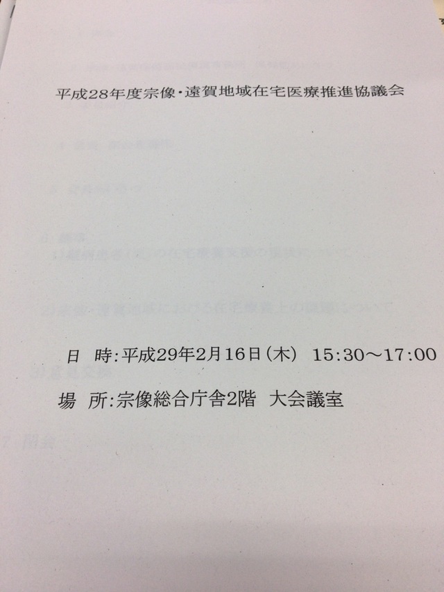 宗像・遠賀地域在宅医療推進協議会に出席してきました。神経難病などの難病指定されている患者さんの在宅医療を進めていくうえでの協議会でした。