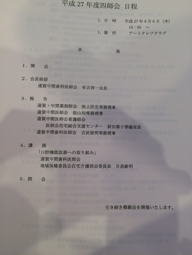 四師会(医師会、歯科医師会、薬剤師会、看護師会)での会合の中で発表させていただきました。口腔機能改善への取り組みという演題でした。地域医療構想や地域包括ケアシステムの構築には多職種連携が欠かせません。