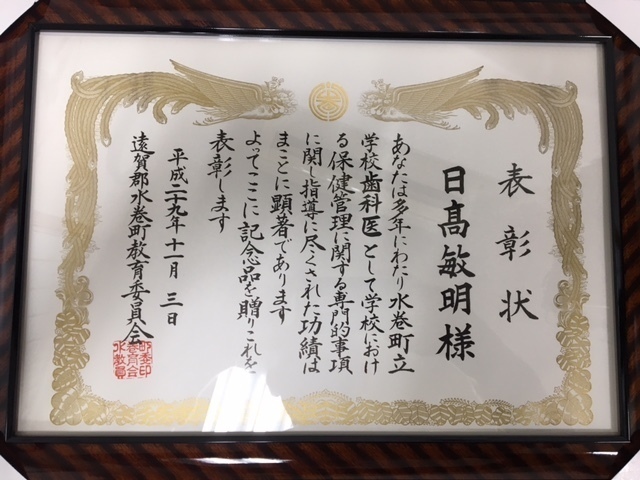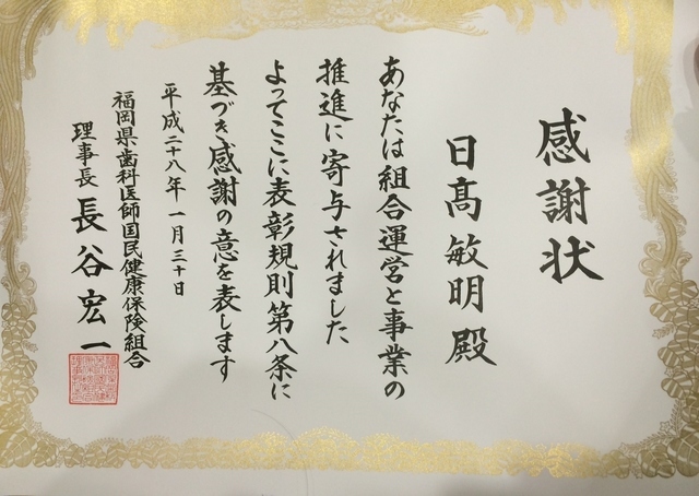 福岡県歯科医師会から感謝状をいただきました。