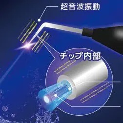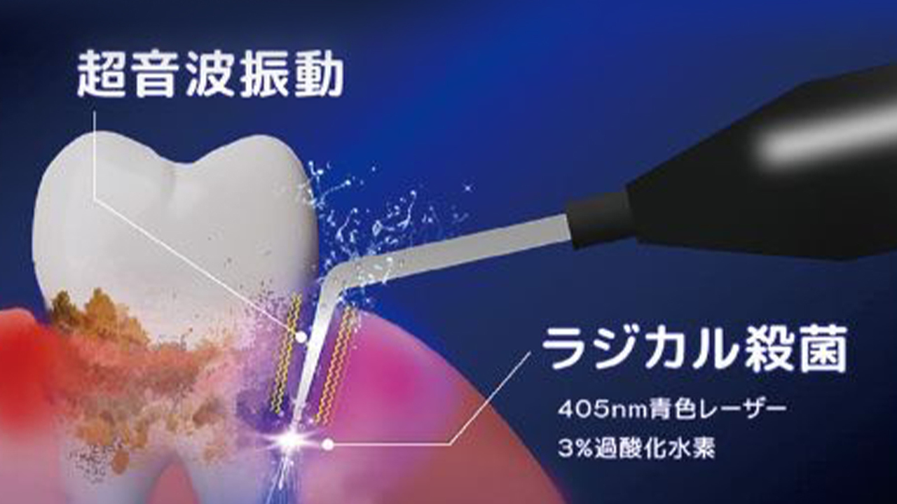 同時に、機器の先端を超音波振動させることで、歯石やバイオフィルムも除去。殺菌とクリーニングを並行して行うため、処置効率が高いのが特徴です。