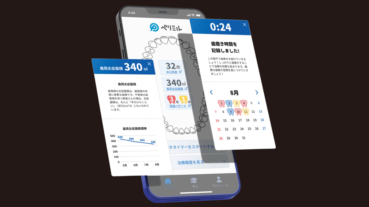 当院ではこの課題に対応するため、コミュニケーションアプリ「ペリミル」を導入しました。患者さまが自分のお口の状態に継続して関心を持てるようサポートするアプリで、放置や怠慢などの生活習慣に気づき、少しずつ行動を改善することを目的としています。